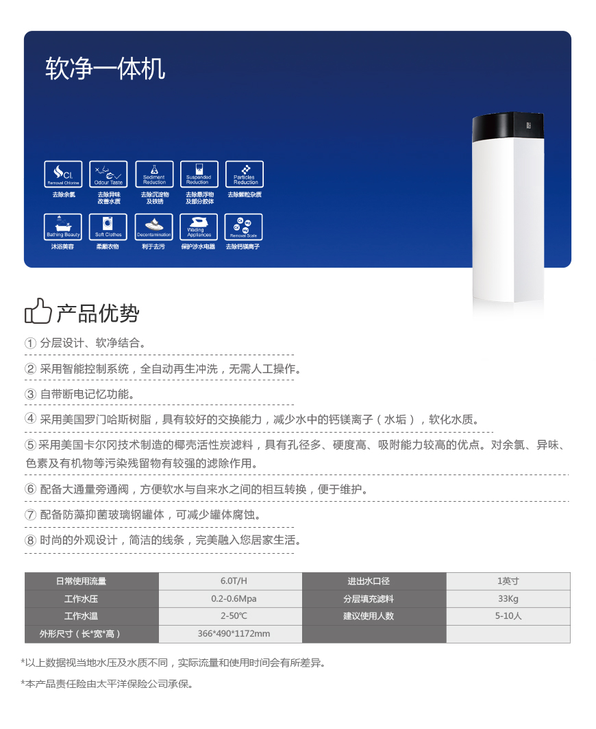 软化水系统:在软净一体机中装有软化剂树脂,是一种人造的离子交换树脂。离子交换树脂是一种聚合物,带有相应的功能基团,含有软性矿物质钠,可以与水中的钙、镁等硬性矿物质发生离子交换反应。当水中的钙镁离子含量高时,离子交换树脂可以释放出钠离子,功能基团与钙镁离子结合,钙、镁离子就被吸附在机内的树脂上,这样水中的钙镁离子含量降低,水的硬度下降。同时,钠不会以水垢的形式堆积在物体表面上,也就减轻了水垢。当树脂上的大量功能基团与钙镁离子结合后,树脂的软化能力下降,可以用氯化钠溶液流过树脂,此时溶液中的钠离子含量高,功能基团会释放出钙镁离子而与钠离子结合,这样树脂就恢复了交换能力,这个过程叫作“再生”。